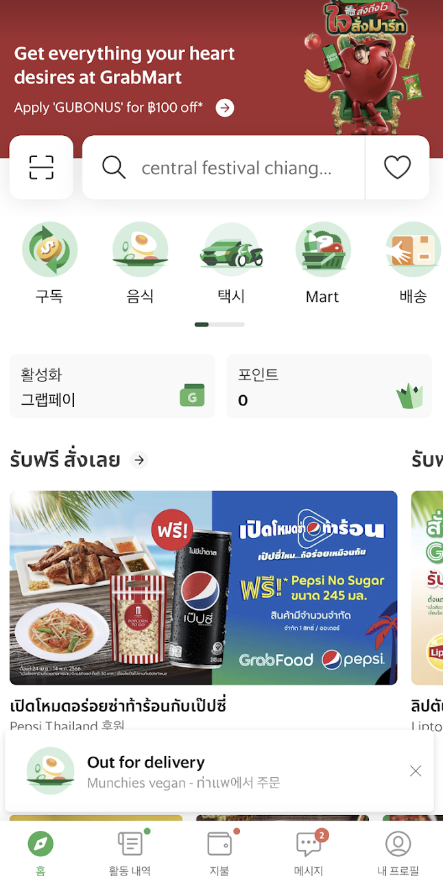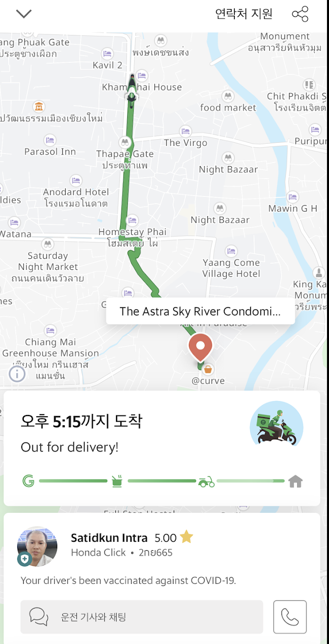 치앙마이까지 와서 배달음식을 시켜먹을 줄 몰랐네요 ㅎㅎ 약간 비싸긴 해도 경험이라 생각하고~ 기사님꼐 로비에서 만나자고 영어로 채팅창에 남겼어요~ 그런데 기사님이 잔돈이 없어서 호텔 앞 편의점에 가서 바꿔오는 해프닝이 있었네요 ㅎ