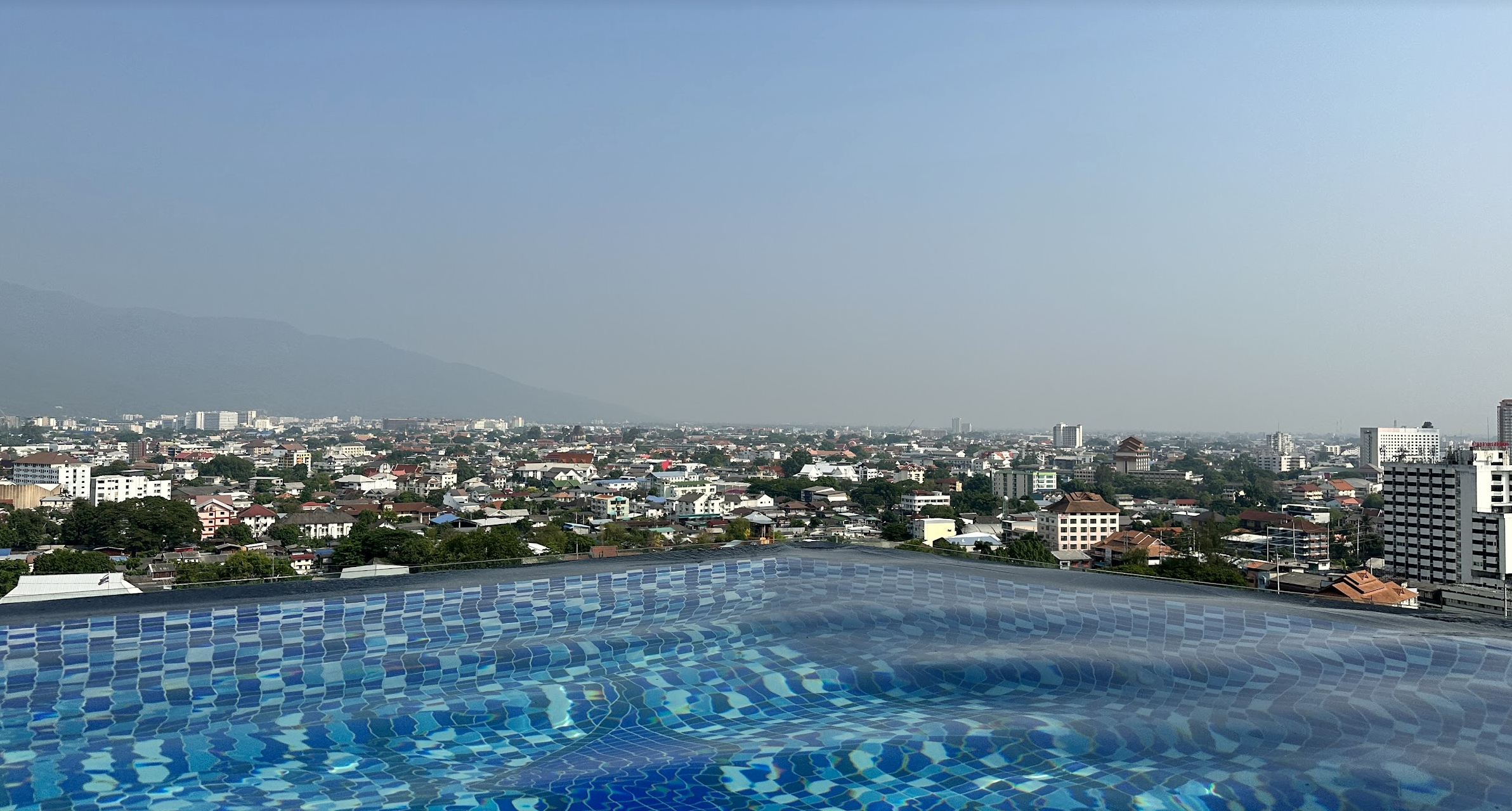 일몰 시간에 맞춰서 17층의 루프탑 수영장으로 올라갔더니, 세상에~ 엄청나게 큰 인피니트 수영장에서 바라보는 치앙마이의 일몰은 정말 환상적이네요~ 요즘 대기오염 때문에 아주 깨끗한 일몰은 아니지만 그래도 멋집니다!